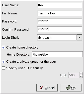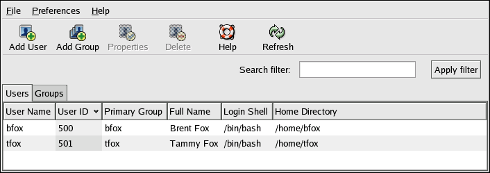 To use User Manager, you must be running the X Window System, have root privileges, and have the redhat-config-users RPM package installed. To start User Manager from the desktop, go to the Main Menu Button (on the Panel) => System Settings => Users & Groups or type the command redhat-config-users at a shell prompt (for example, in an XTerm or a GNOME terminal).