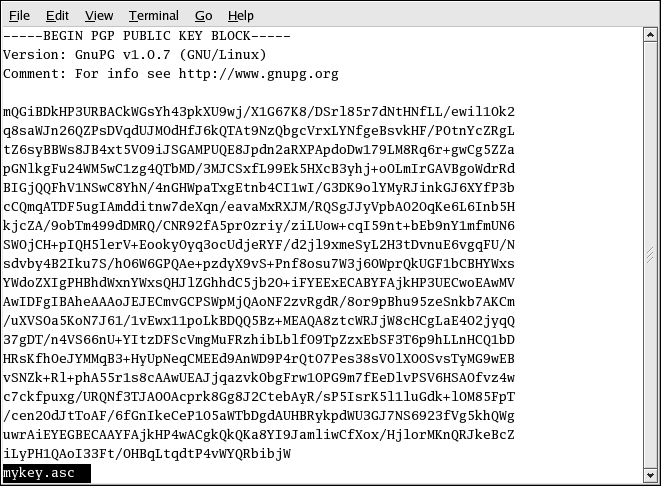 Open your exported public key file (such as mykey.asc, which was created in the Section called Exporting your Public Key) with a pager — for example, use the less mykey.asc command.