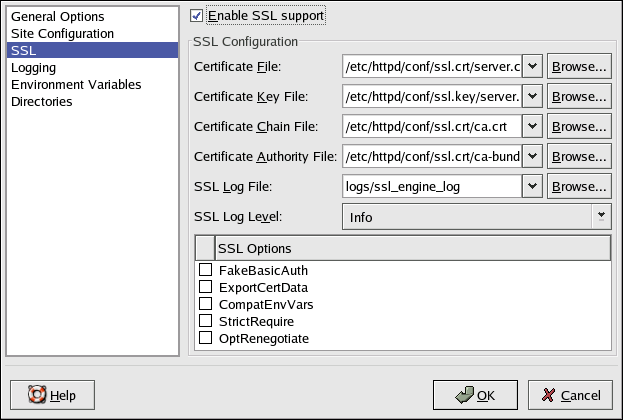 If an Apache HTTP Server is not configured with SSL support, communications between an Apache HTTP Server and its clients are not encrypted. This is appropriate for websites without personal or confidential information. For example, an open source website that distributes open source software and documentation has no need for secure communications. However, an ecommerce website that requires credit card information should use the Apache SSL support to encrypt its communications. Enabling Apache SSL support enables the use of the mod_ssl security module. To enable it through HTTP Configuration Tool you must allow access through port 443 under the Main tab => Available Addresses. Refer to the Section called Basic Settings for details. Then, select the virtual host name in the Virtual Hosts tab, click the Edit button, choose SSL from the left-hand menu, and check the Enable SSL Support option as shown in Figure 18-9. The SSL Configuration section is pre-configured with the dummy digital certificate. The digital certificate provides authentication for your secure Web server and identifies the secure server to client Web browsers. You must purchase your own digital certificate. Do not use the dummy one provided in Red Hat Linux for your website. For details on purchasing a CA-approved digital certificate, refer to the Chapter 19.