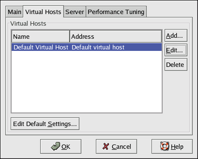To add a virtual host, click the Virtual Hosts tab and then click the Add button. You can also edit a virtual host by selecting it in the list and clicking the Edit button.