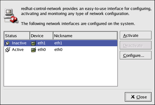 Network devices can be configured to activate at boot time or not to start at boot time. For example, a network device for a modem connection is usually not configured to start at boot time; whereas, an Ethernet connection is usually configured to activate at boot time. If your network device is configured not to start at boot time, you can use Red Hat Control Network to activate it after boot time. To start it, select Main Menu Button (on the Panel) => System Tools => Network Device Control or type the command redhat-control-network.