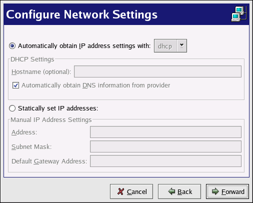 On the Configure Network Settings page as shown in Figure 11-1, choose between DHCP and a static IP address. If the device receives a different IP address each time the network is started, do not specify a hostname. Click Forward to continue.