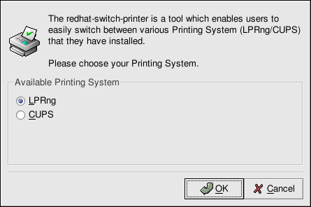 To use the CUPS printing system instead of LPRng, run the Printer System Switcher application. Start it by selecting to the Main Menu Button (on the Panel) => Extras => System Settings => Printer System Switcher, or type the command redhat-switch-printer at a shell prompt (for example, in an XTerm or GNOME terminal).