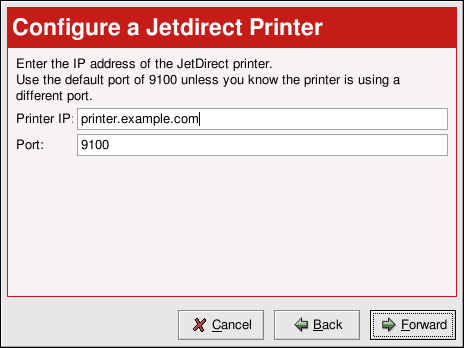 To add a JetDirect printer, click the New button in the main Printer Configuration Tool window. The window shown in Figure 26-1 will appear. Click Next to proceed.
