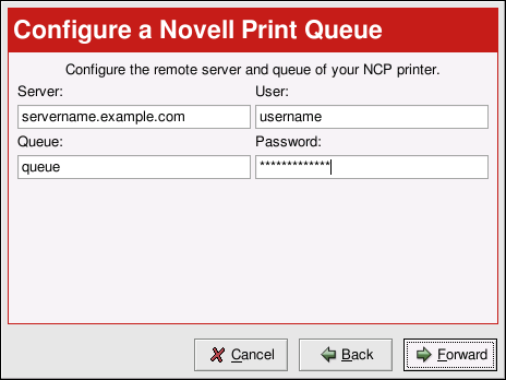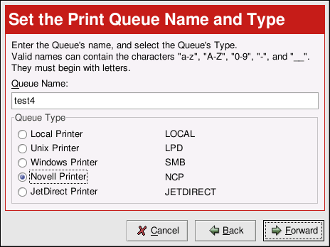 To add a Novell NetWare (NCP) printer, click the New button in the main Printer Configuration Tool window. The window shown in Figure 26-1 will appear. Click Next to proceed.