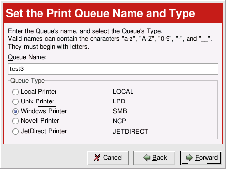 Select Windows Printer from the Queue Type menu, and click Next. If the printer is attached to a Microsoft Windows system, choose this queue type.