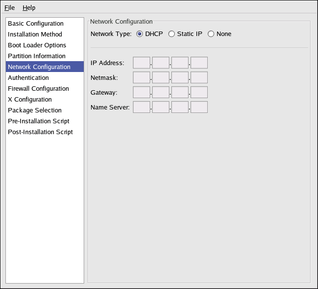 There are three network configuration options: DHCP, Static IP, and None. If there is not an Ethernet card in the system, choose None.