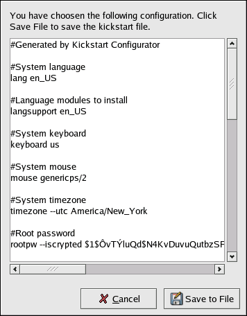 After you have finished choosing your kickstart options, if you want to preview the contents of the kickstart file, select File => Preview from the pull-down menu.
