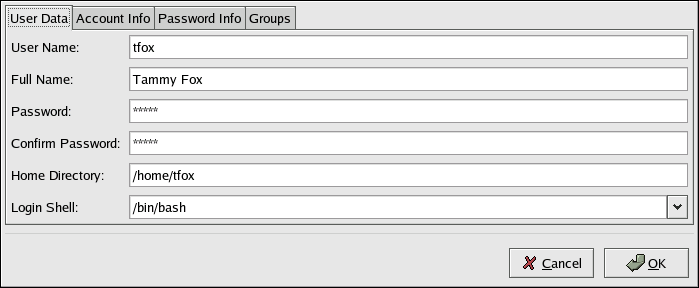 User Data — Basic user information configured when you added the user. Use this tab to change the user's full name, password, home directory, or login shell.