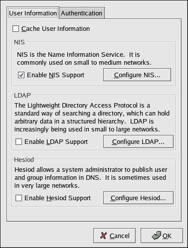 The Authentication Configuration Tool provides a graphical interface for configuring NIS, LDAP, and Hesiod to retrieve user information as well as for configuring LDAP, Kerberos, and SMB as authentication protocols.