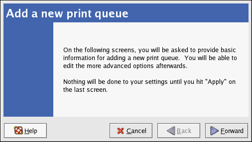 To add a local printer, such as one attached through a parallel port or USB port on your computer, click the New button in the main Printer Configuration Tool window to display the window in Figure 27-2. Click Forward to proceed.