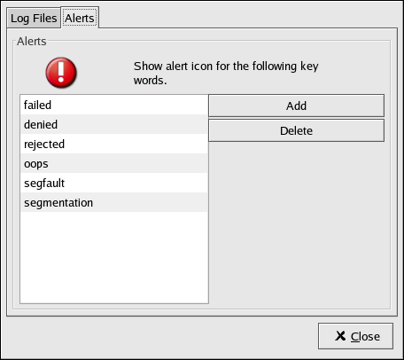 Log Viewer can be configured to display an alert icon beside lines that contain key alert words. To add alerts words, select Edit => Preferences from the pulldown menu, and click on the Alerts tab. Click the Add button to add an alert word. To delete an alert word, select the word from the list, and click Delete.
