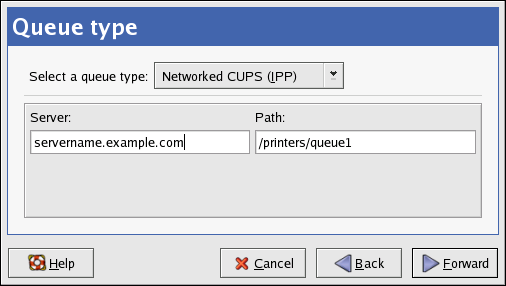 After clicking Forward, Figure 27-5 appears. Select Networked CUPS (IPP) from the Select a queue type menu.