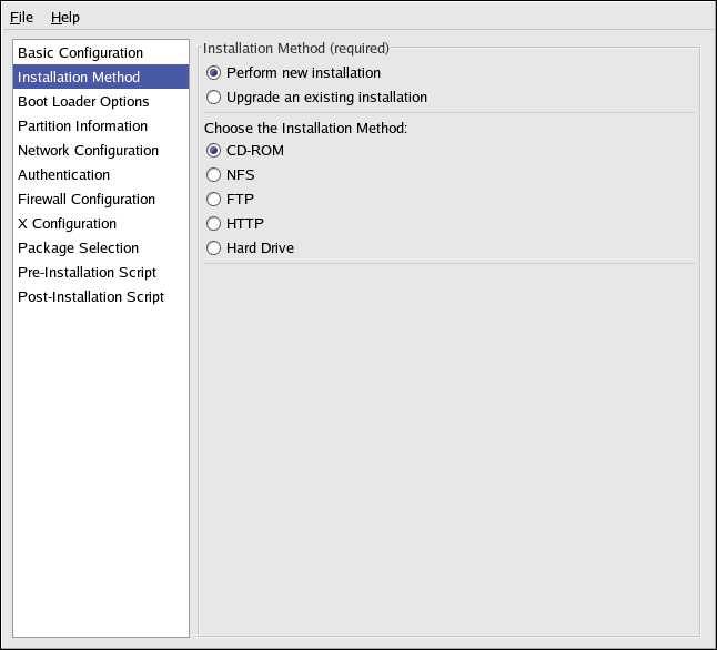 The Installation Method screen allows you to choose whether to perform a new installation or an upgrade. If you choose upgrade, the Partition Information and Package Selection options will be disabled. They are not supported for kickstart upgrades.