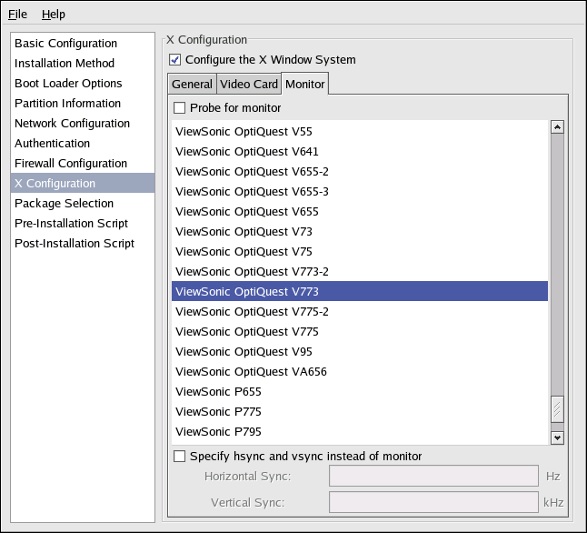 Alternatively, you can select your monitor from the list. You can also specify the horizontal and vertical sync rates instead of selecting a specific monitor by checking the Specify hysnc and vsync instead of monitor option. This option is useful if the monitor for the system is not listed. Notice that when this option is enabled, the monitor list is disabled.