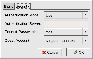 Server — The Samba server tries to verify the username and password combination by passing them to another Samba server. If it can not, the server tries to verify using the user authentication mode. Specify the NetBIOS name of the other Samba server in the Authentication Server field.