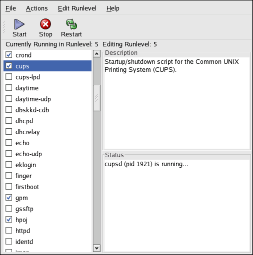 The Services Configuration Tool is a graphical application developed by Red Hat to configure which SysV services in the /etc/rc.d/init.d directory are started at boot time (for runlevels 3, 4, and 5) and which xinetd services are enabled. It also allows you to start, stop, and restart SysV services as well as restart xinetd.