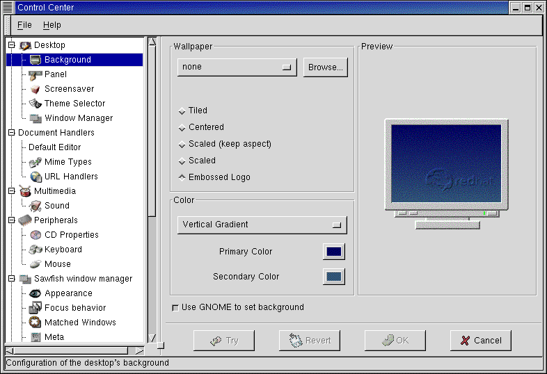 Finally, deselect the option to Use GNOME to set background if you would prefer to set the background through another means (such as through your window manager's configuration program).