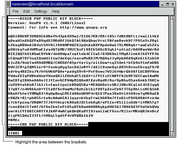 [newuser@localhost newuser]$ gpg --armor --export <you@yourisp.net> > mykey.asc [newuser@localhost newuser]$ |