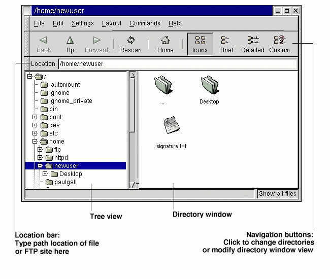 As a new user, it's unlikely you'll find many new files or directories when you first open the file manager. That's because by default, GMC opens in your login directory. Note the file signature.txt, however, in Figure 10-1. This is the signature file the user newuser created while configuring Netscape Messenger.