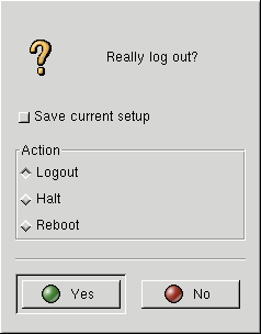 When the confirmation dialog appears (see Figure 1-8), select the Logout option and click the Yes button. If you want to save the configuration of your Panel, as well as any programs which are running, check the Save current setup option, as well.
