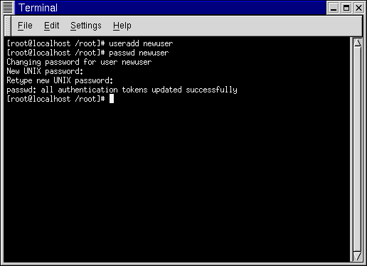 Type useradd, then a space and the name of the new user account (name the account newuser, for example).