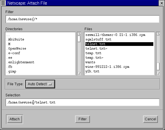 You can drag files from your desktop or from your file manager in the same way that you can drag URLs from Navigator. Just hold your mouse button over the file you want to attach, and drag it to the attachments field of your letter. |