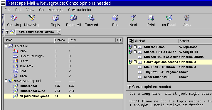 To write a message to your selected newsgroup, click on New Msg on the menu, or go to File => New => New Message. Like writing e-mail, enter your message in the Compose dialog which opens and send your message. It will be posted to your current newsgroup.