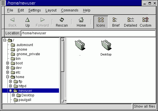 The file manager is actually an application called the GNU Midnight Commander, or GMC. GMC is GNOME's version of the popular Midnight Commander file manager. You can learn more about the File Manager in the section called The GNOME File Manager in Chapter 10 or from the GNOME User's Guide at the GNOME website. |