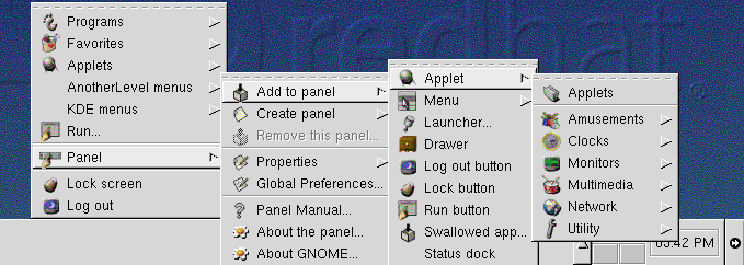 From the Panel, you can launch applications and applets, small applications and utilities which are meant to be docked into the panel. Among the applets already running on the Panel are the GNOME Pager and clock applet.