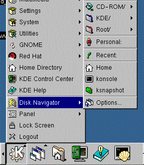 To work with Disk Navigator, just hold your mouse cursor over the application on the main menu; a second menu will open, showing the files and folders to which you have access. Under Root/, for example, you'll find directories on your system from root of the directory tree. Under the KDE/ directory, you'll find folders that point to system documentation, games, libraries, and more.