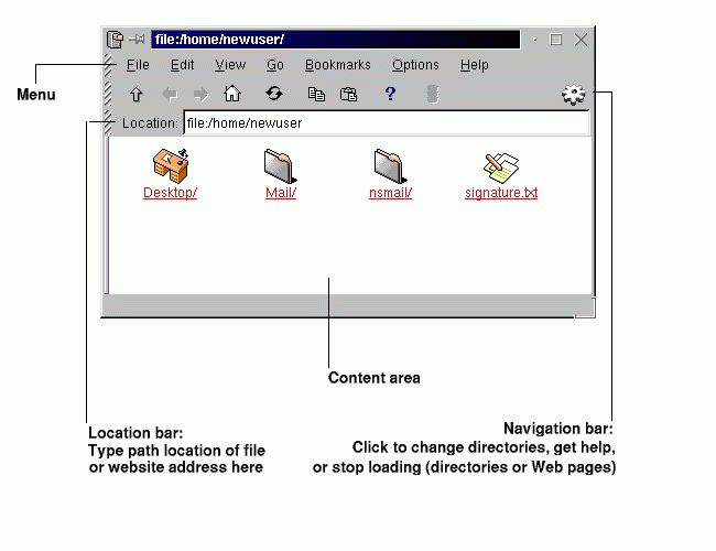 If you've used a Web browser or file manager before, you'll feel right at home moving around with KFM. You can type the path location of a file (and the address of a website or FTP site) in the Location bar. Above the Location bar, icons on the Navigation bar help you quickly move to other directories. Briefly, here's what the icons mean: