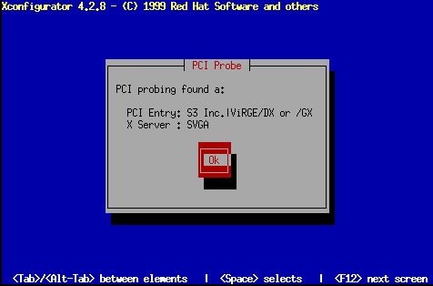 To continue, tab until the Ok button is highlighted and press Enter. Xconfigurator will then probe your system for your video card, and suggest the correct X server to match your system, as in Figure 17-4. Click the Ok button to proceed.
