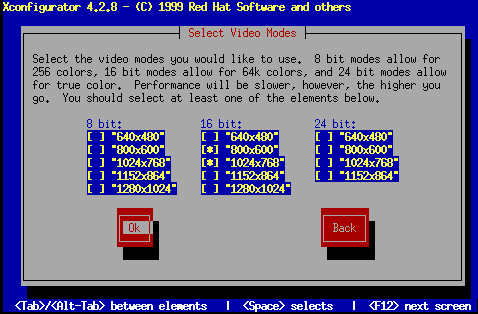 You can select more than one screen resolution -- for example, if you prefer 800x600 and 1024x768, you can adjust your resolution "on the fly." To do this, use the Ctrl-Alt-+ (plus) or Ctrl-Alt-- (minus) keys. |