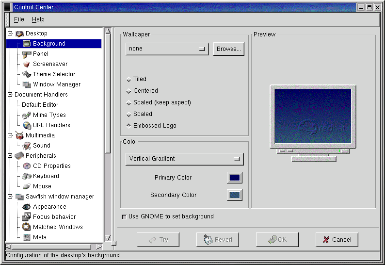 You can deselect the option to Use GNOME to set background if you would prefer to set the background in another way (such as through your window manager's configuration program).