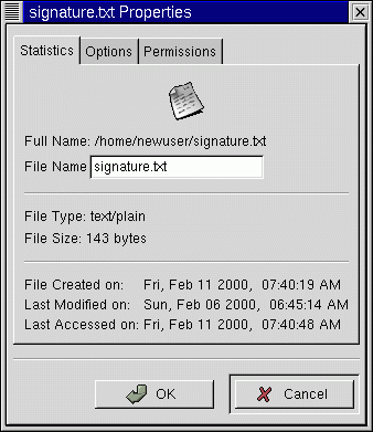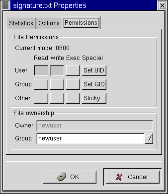 Essentially, these items refer to user management and permissions. UID means User ID, a unique number given to every user on the system; GID means Group ID, the ID of the user's default group. You probably won't have to worry about setting the sticky bit, but basically, setting a directory with a sticky bit gives it even more security. If a person wants to remove or rename a file that has a sticky bit, that person must own the file, own the directory, have "write" permission, or be root. For more about how to work with permissions, see the section called Ownership and Permissions in Chapter 10. Once you understand the ideas behind file permissions, you may find using the Permissions tab is a convenient way to change a file or directory's permission settings. |