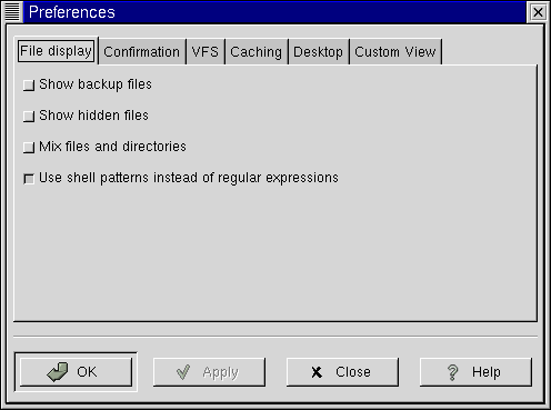 File display — Modify the way files are viewed. Select Show backup files to reveal backup files. Select Show hidden files to show dot files (usually configuration files and directories). Mix files and directories allows you to see files and directories in the order you select in the directory window. You probably will not need to worry about the Use shell patterns... choice, since it concerns sorting with regular expressions, which is more useful to advanced users.