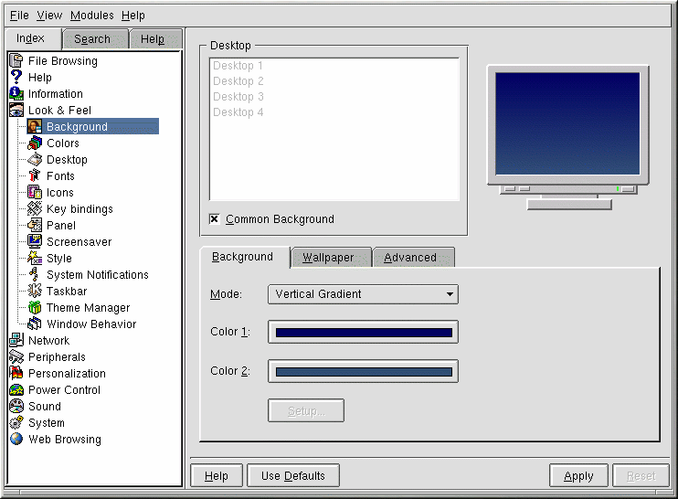 To change your desktop background in KDE, open the KDE Control Center, click on Look and Feel and then on Background. The Background category of the KDE Control Center will look like Figure 4-3.