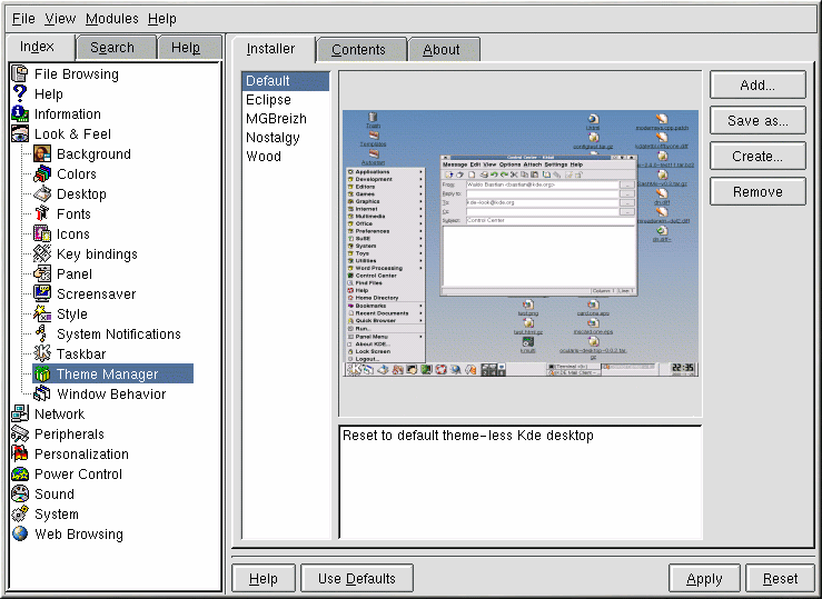 To begin, select the Theme Manager category (see Figure 4-4). By default, you have several themes, but there are quite a few more themes available at http://kde.themes.org.