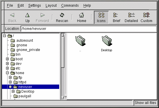 GNOME's file manager is an application called the GNU Midnight Commander, or GMC. GMC is GNOME's version of the popular Midnight Commander file manager. You can find more about the File Manager later in this manual or from the GNOME User's Guide at the http://www.gnome.org. |
