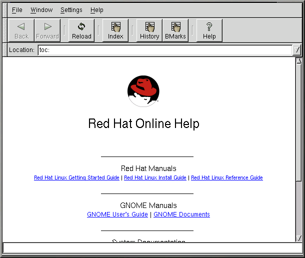 The GNOME Help Browser (see Figure 2-8) is a useful utility. Since this application displays not only GNOME-related help but also info pages and man pages, the GNOME Help Browser can be an invaluable resource for learning about both GNOME and your Red Hat Linux system. (Info pages and man pages are concise help documents which are usually installed on a Linux system. See the introductory chapter, the section called Introductory Terms in Introduction.)