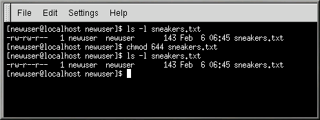 If you want to change sneakers.txt so those in your group won't have write access, but can still read the file (as shown in Figure 10-16), remove the access by subtracting 2 from that set of numbers.