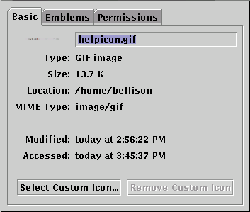 Emblems can be added to a file icon, indicating that the file is personal, new, a draft, very important, a personal favorite, and so on. Click on the Emblems tab to select informational emblems for a file. Use the check boxes next to the emblems to add or remove them.