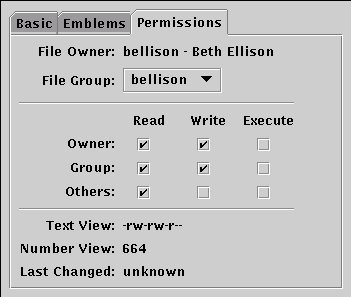 To change a file's properties, right-click on a file or directory in the directory window and choose Show Properties. A dialog, similar to Figure 11-2, opens.