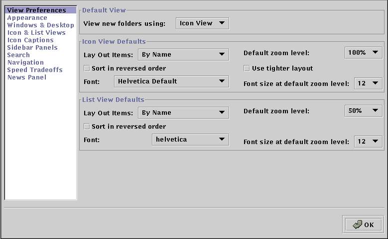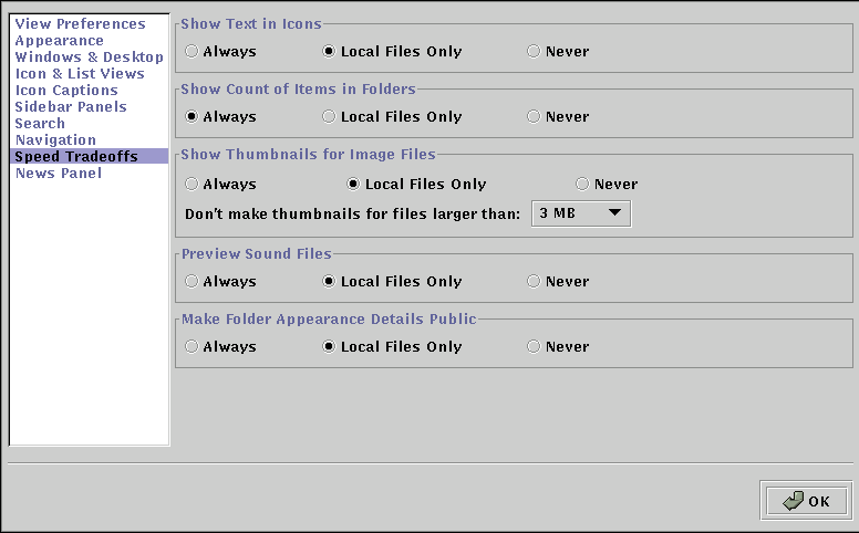 The Show Text in Icons option shows a portion of a text file's contents on the actual icon. Directory folders show, by default, the number of items they contain; change this option under Show Count of Items in Folders. Icons for image files can look like the images themselves; choose your preference for this option, under Show Thumbnails for Image Files. Excerpts of sound files can be previewed automatically by placing the cursor over the icon or file name; choose your preferences for this option under Preview Sound Files.