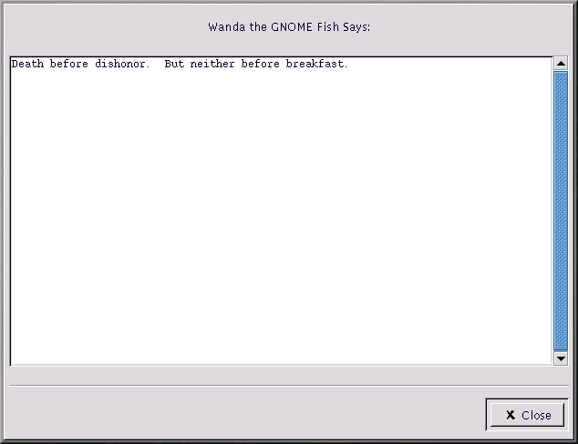 Computer programmers can be very entertaining people. Little applets are created and added to software for no other reason than to amuse. In GNOME, go to Main Menu => Applets and look through the applets available in Amusements, Clocks, and Utility. Fish will open a dialog box (Figure 8-2)displaying a quote that changes every time you click on the icon. gEyes will add two eyes to your panel that follow your cursor around the screen. Gnome Weather (which is under Utility)will dock a button on your panel that displays a miniature weather report.