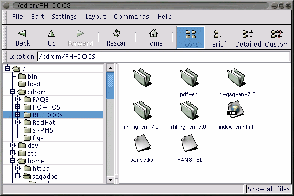 If you have the Official Red Hat Linux boxed set, remember to take a look through the Red Hat Linux 7.2 Documentation CD. All of our manuals are on this CD, as well as other useful resources. Inserting the Documentation CD in the CD-ROM drive should automatically open the file manager (Obviously, you will need to be logged in to do this. See Chapter 1 for information on how to log in). If the file manager does not open automatically after a minute or so, right-click on the CD-ROM icon on your desktop and select Mount Device or Mount, whichever appears on the pop-up menu.