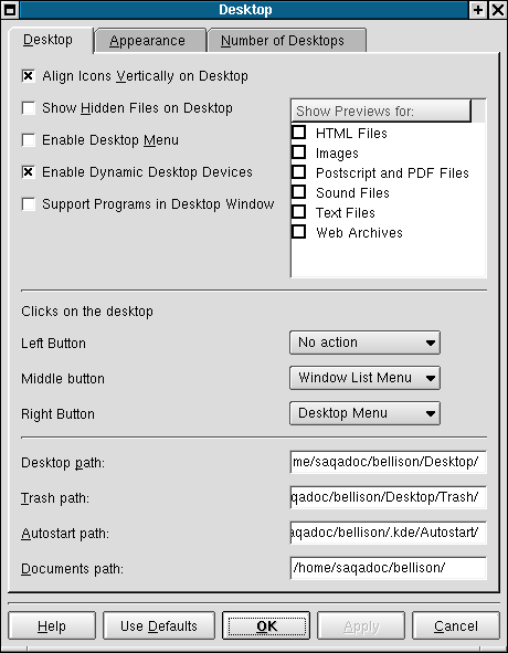 You can increase (or decrease) the number of desktops available to you by adjusting the slider at the top of the Desktops tab. For more desktops, drag the bar to the right; for fewer desktops, drag the bar to the left. The Desktop, Appearance, and Number of Desktops tabs are where you can make various desktop configuration selections, like icon arrangement and font size.