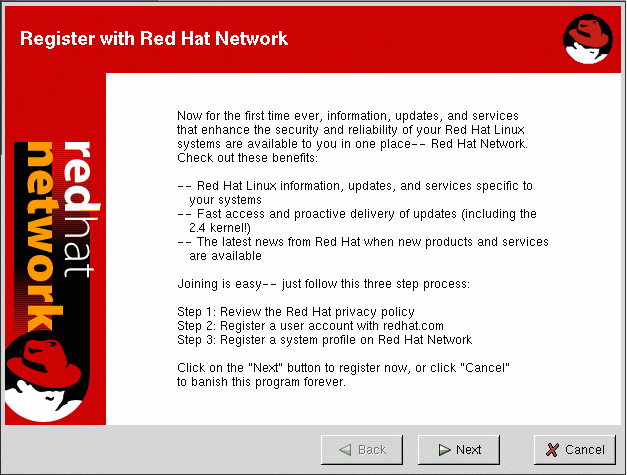Before you begin using Red Hat Network, you need to create a user name, password, and system profile. The Red Hat Network Registration Client will take you through this process.