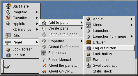 To add the button to your panel, right-click on the panel and select Panel => Add to panel => Log out button (see Figure 2-10). Now, when you want to log out, just click on this button.